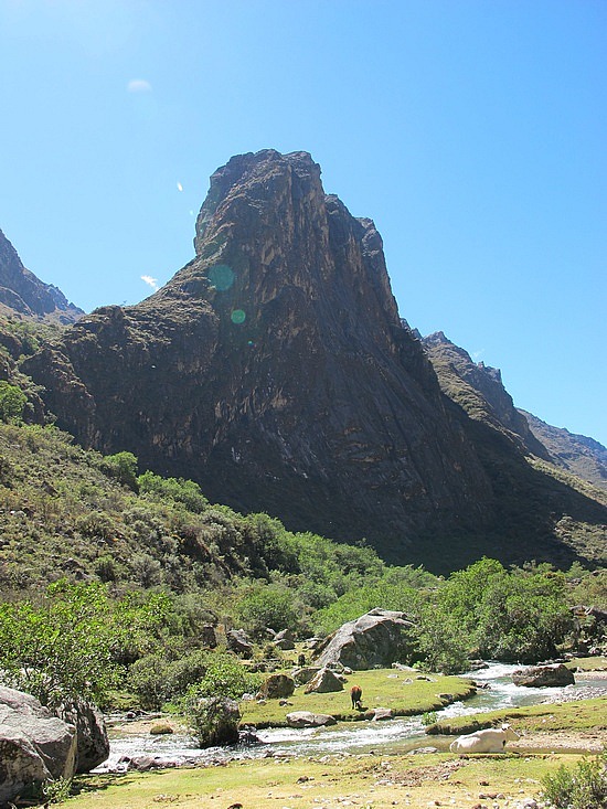 Debout vers 6h15, petit déjeuné au bord de la lagune et on remballe. On est super surpris ça va assez vite à 7h45 on repart ! La 2ème journée est plus simple, c’est assez plat, on arrive (déjà) au campement à 12h00. On décide alors de monter la tente, de laisser un sac et d’aller voir la lagune Arhueycocha qui n’est pas très loin… Enfin on croyait qu’elle n’était pas très loin… Sur notre chemin, on croise des ossements d’animaux… C’est assez flippant, même un cheval qui est à moitié mangé…Après 2h00 de marche on arrive au pied de la lagune et là il faut faire une de ces montées… Sophie laisse tomber (on a déjà marché 17km), Nuno y va J. En haut c’est top, un glacier tombe dans la lagune et il y a de la glace qui flotte dans l’eau. Nuno redescend, prend Sophie en chemin et on reprend notre route en sens inverse. On arrive à nouveau au campement vers 16h30. Aujourd’hui on a marché 23km, on est un peu fatigué. On cuisine et au lit.